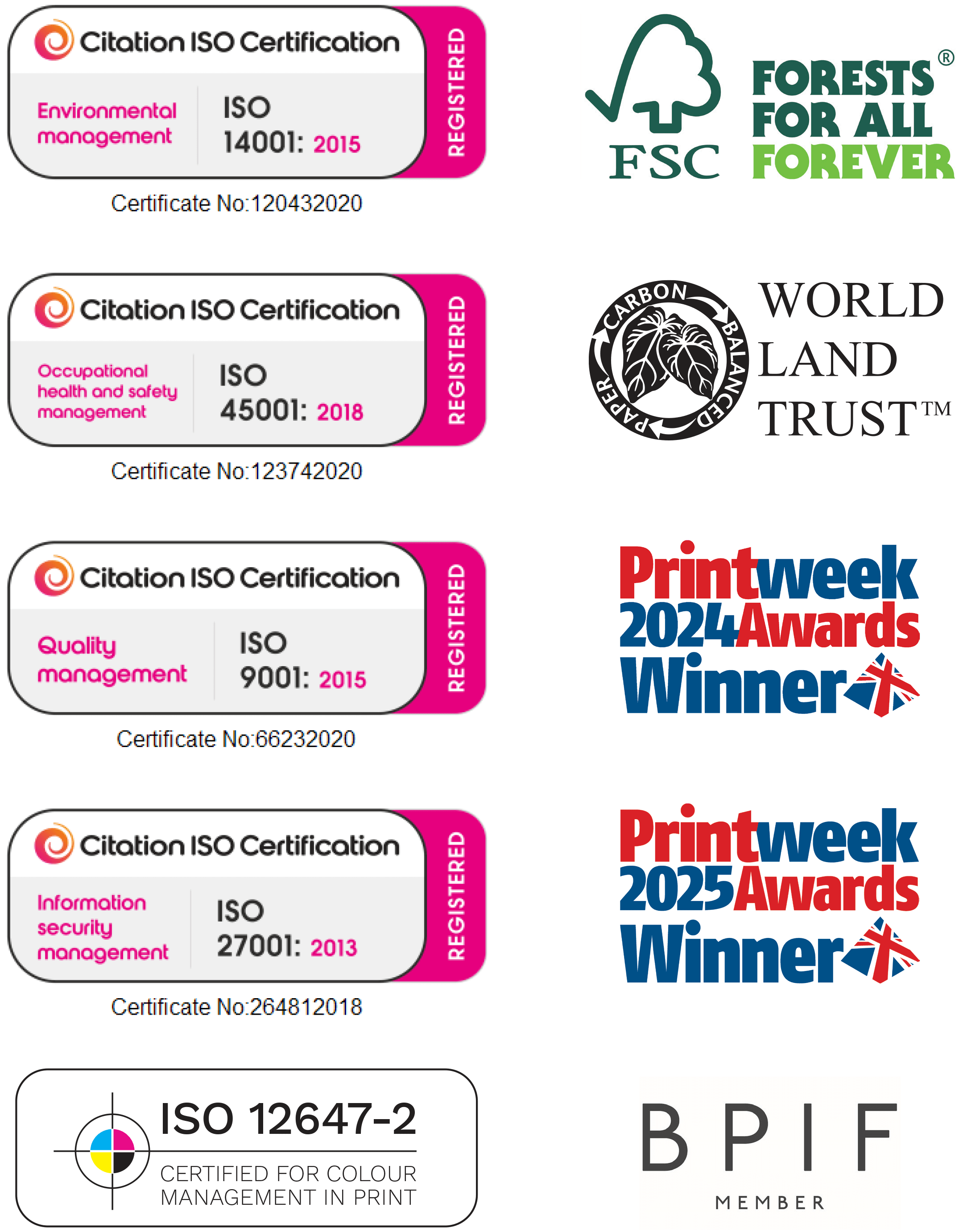 These prestigious accreditations reflect our commitment to excellence in quality management, environmental sustainability, occupational health and safety, information security, and colour management.